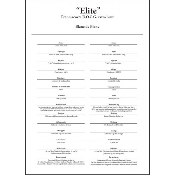 | Name “Elite” extra brut Type Blanc de Blanc Franciacorta Docg Vignard “CRU” Mirabella (1981) Grape Chardonnay (100%) Location Morain hill media Farming System Silvoz Yield 7500 kg/hectare Wine-making Manual selection of the best bunches during filling machines, Bottling In may following the harvest Refining On the yeasts for 24 months Dosage Extra brut 5 g/litre of sugar Alcohol content 12,50 % vol Sulphites <10 mg/litre (limit statement 10 mg/lt) maximum content permitted by law 235 mg/litre Particularity 3 winemakers, 10 years of research, 4 university theses. The First Franciacorta and the First Italian | |